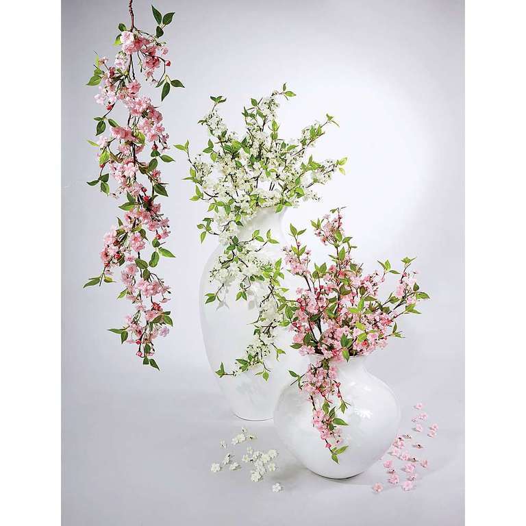 Artikelnummer: 70874600 Blossom branch with a large number of delicate blossoms and leaves in a fresh green colour for an elegant spring decoration. Artificial branches are ideal for floral vase decorations as well as a beautiful eyecatcher on the table or counter. High-quality product made of fabric material and plastic. Price per piece.