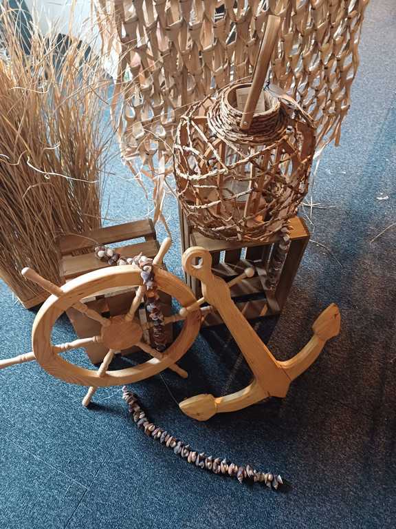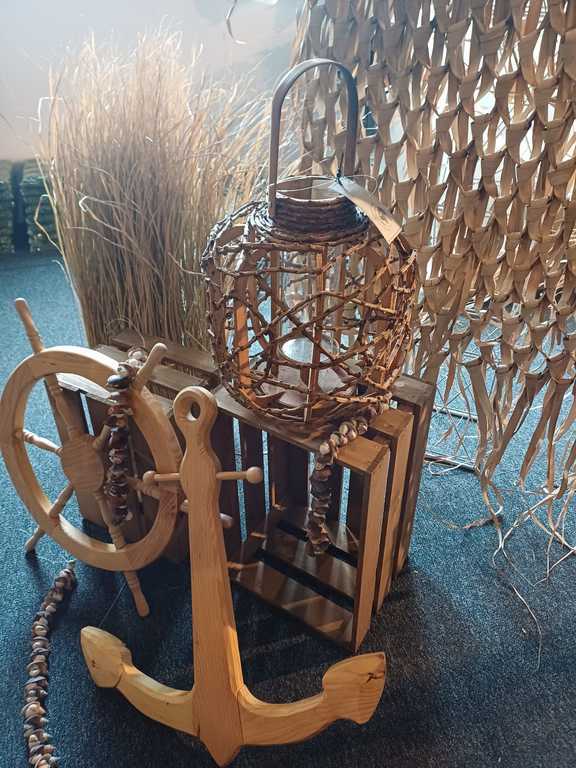 Lattenkisten 2 dlg bruin, Lantaarn met windlicht, gevlochten achterwand decoratie 70x 100cm met ophangmogelijkheid, Anker 60cm, stuurwiel circa 47cm Ø x 3cm dikte , 3 schelpjeshangers circa 50cm lengte, Duingras circa 50x100x12cm