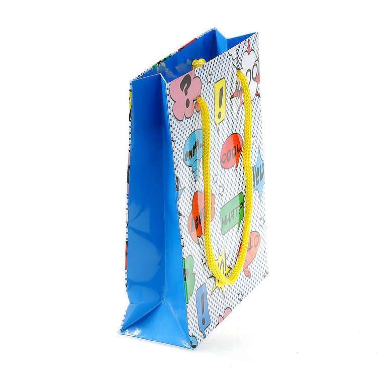 shiny varnished paper bag with yellow fabric cord in an exotic comic design and a blue side fold, base and edges are reinforced, ideally suited for small gifts for birthdays, beginning of school or party favours, price per pack of 12.