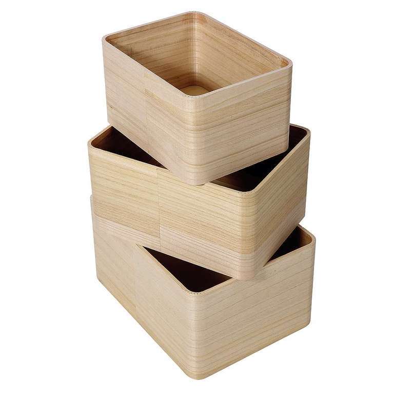 Practical wooden boxes in 3 complementing sizes. The small decorative boxes are very versatile and can be used as bins, shelves or stacks, a simple and universal box system made of light, raw 5 mm plywood. Price per 3-piece set.