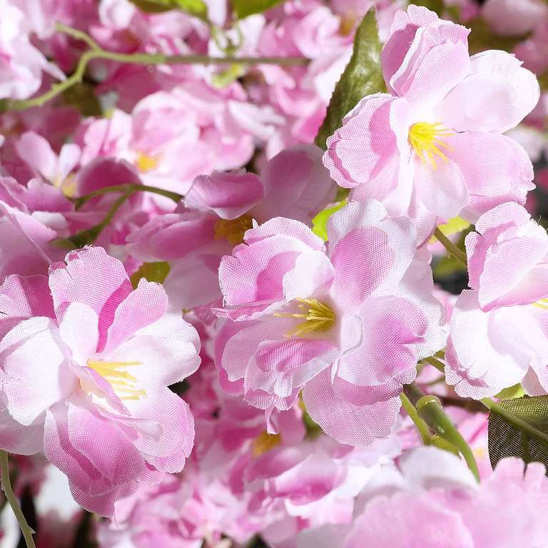 This imposing cherry tree is an impressive eye-catcher and is suitable as a carefree decoration for wellness and business areas as well as in shop windows. The intensive colourfulness of the full textile blossoms as well as the hanging branches provide a romantic spring decoration. The artificial tree with a trunk height of approx. 95 cm consists of a plastic trunk in wood look with a mossy base 30 cm Ø, on which the tree crown is mounted. The branches are delivered separately and are simply put on, so they keep their shape during transport.