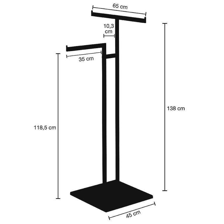The elements of our NOVUS series can be easily combined which makes it easy to create a modern and functional interior design. This high-quality T-stand is ideal for the presentation of clothes and accessories. Suspension arms with edge pin prevent slipping of hanging goods. Height 118.5 and 138 cm and arm length 35 cm and 65 cm respectively. The 20 mm square-cut frame is completely welded and therefore very stable. DIY assembly of the base plate (45 x 45 cm) via the included hex key. The high-quality powder coating creates a matt look, prevents rust and corrosion and guarantees durability and stability for your clothes stand. Price per piece.